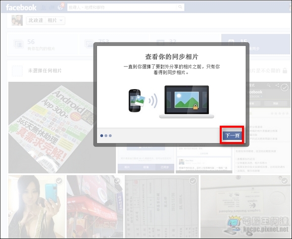 接著回到同步相簿選項中就可以看到照片正在上傳中(灰色代表還在上傳),要注意的是手機的耗電量可能會因此暴增(可改勾選「只透過Wi-Fi同步」),自動同步上傳到FB的照片都是私密相簿外人是看不到的,除非你自己在PO文時將其公開: