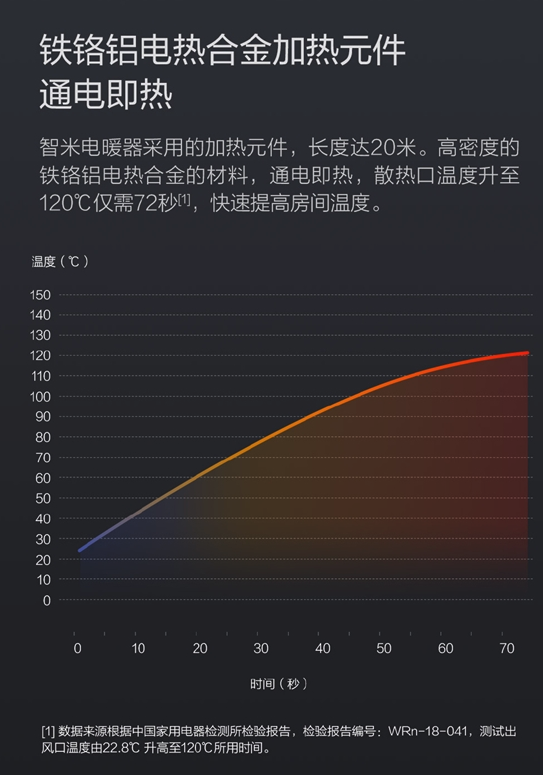 此外,機身內搭載的加熱元件,長度達 20 公尺,且通電即熱,散熱口溫度上升至 120 度僅需 72 秒,非常快速: