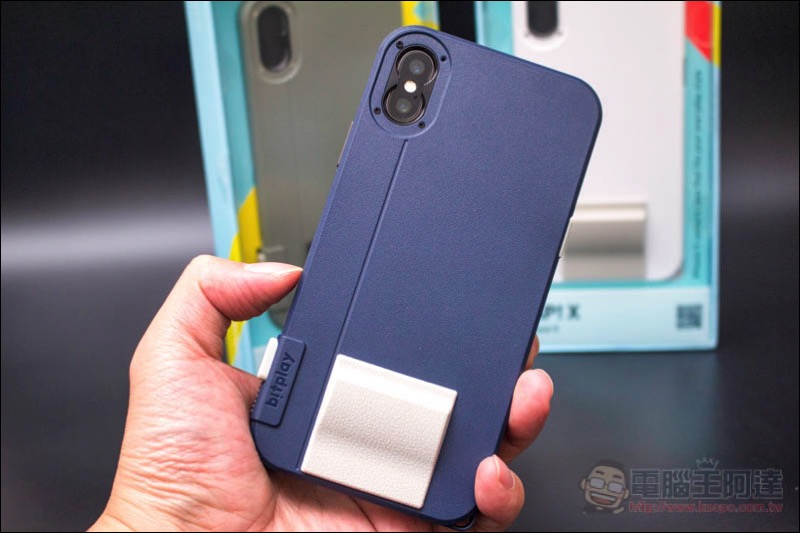 藍色真的非常好看,再加上表面磨砂質感,看起來相當精緻,重量也感覺沒增加多少。而 iPhone X 直拿正常使用的情況,下方那塊黏貼式相機手把也剛好讓手掌多一個支撐點,單手持握更穩固: