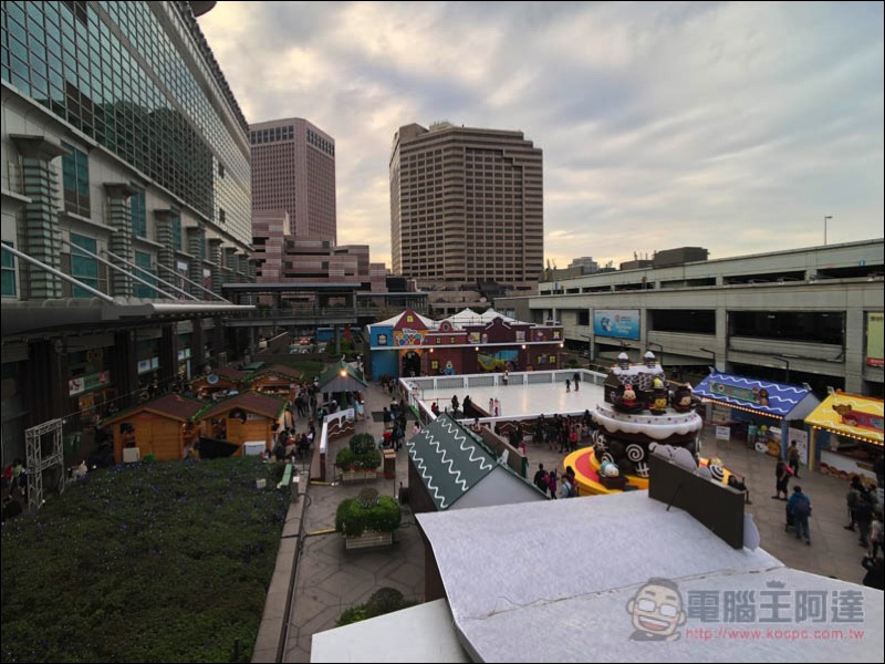 下面這張圖是在信義微風與新光山越中間走道所拍的,當時我想要用比較特別的角度,來呈現左邊建築物的高度,同時又保留天空走道的垂直線條,如果是用 iPhone X 本身的鏡頭來拍完全不行,即便蹲的再低: