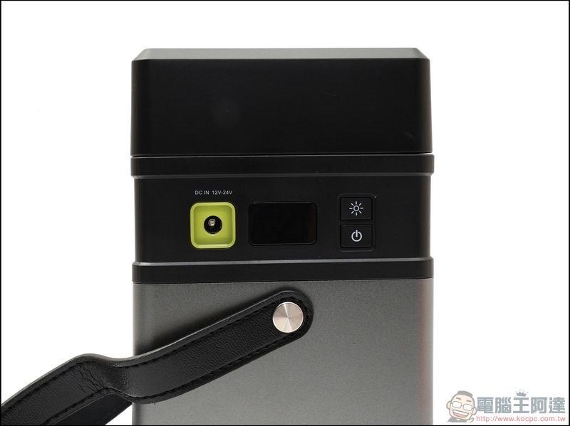 在 SPU-50000 頂端配置了一組 AC 插座(要充電時必須打開左邊的開關),可以幫筆電或一般電器提供電力(最高輸出功率100W)電競筆電之類超過100W的筆電可以關機充電,但無法邊充電邊使用,吹風機之類的電器(超過300W)就推不動了。在頂端有一個旋鈕,轉開就可以把上半部區域卸下: