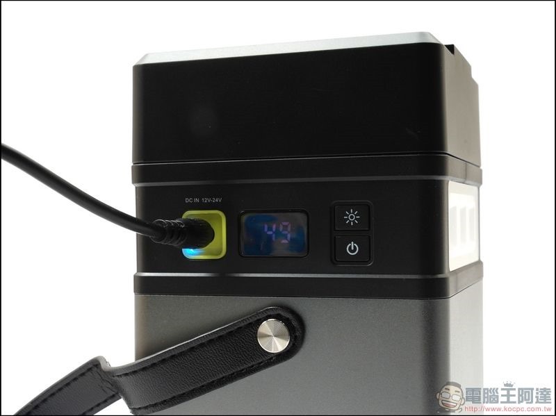 左邊配置 SP-50000 的 DC IN 充電埠、電量顯示LED螢幕、LED露營燈開關與電源開關: