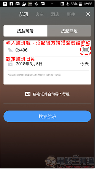 在添加行程的功能中,你可以查詢航班、火車、酒店等,不過火車部分是中國的火車,酒店部分大家可以尋求的比價網站更多,而 C 編自己是最常用來查飛機資訊,你可以輸入航班號碼與日期查詢,也可以按照起降地點來查詢,還可以支援掃描登機證上的條碼來找尋航班資訊。