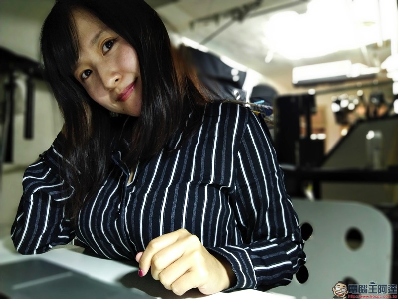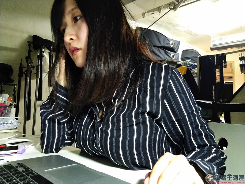 下方是室內低光源處有景深效果時的照片與沒景深時的對比,臉部五官沒有問題也沒有變化,但在無景深模式時,背景也很清晰,導致整體成像有些扁平,感覺是很家常的一張自拍照;但一樣的場景、一樣的人,景深效果開啟之後,哇哇,整個畫面的層次就出來了,沒有對比的話感覺不出來有景深效果的好,但對比之下就頗明顯: