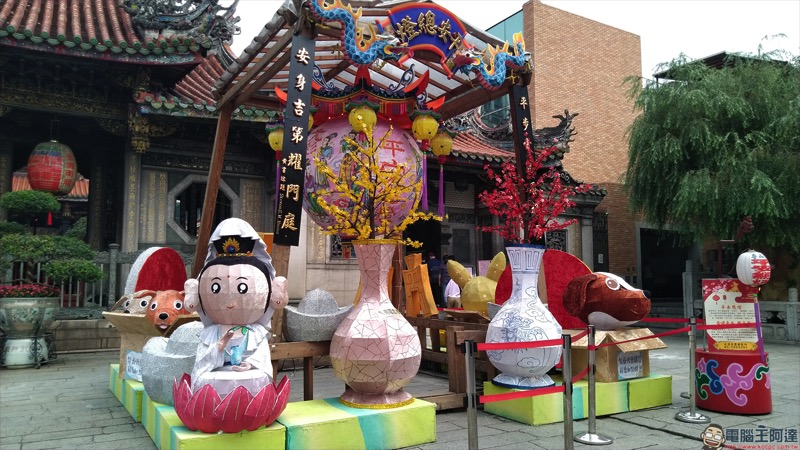 全景照不但簡單,而且效果非常好,阿達故意挑選光線落差很大的地方拍攝全景,但是外面暴露在光線底下的龍山寺本體依然清楚沒有曝光過度變成白光一片;而裡面陰暗的服務處依然無比清楚;最下面是站在外頭拍攝大門與寺門還有元宵節特別裝飾的全景照,效果非常好。