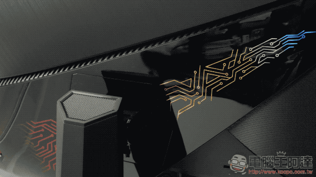 螢幕正面已經可以約莫看出可以帶來更沈浸感受的曲面螢幕的曲度,左下角可以看到標示著 SteelSeries GameSense 的獨家合作標示: