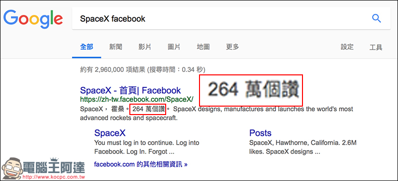 雖然使用 Google 關鍵字搜尋 Tesla 或 SpaceX 加上 Facebook 進行搜尋,仍可看到連結資訊,可以清楚看到它驚人的粉絲數量: