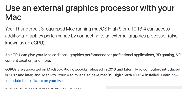 而官網英文頁面中,就有仔細講解這次新加入支援外部圖形處理器(eGPU)的細項。首先連接方式當然就是透過 Thunderbolt 3 介面,並不是所有 Mac 都支援,MacBook Pro 2016 年以後的機種、iMac 2017 年以後的機種以及 iMac Pro 才享有,意味著機型太久的人只能跟你說聲抱歉。