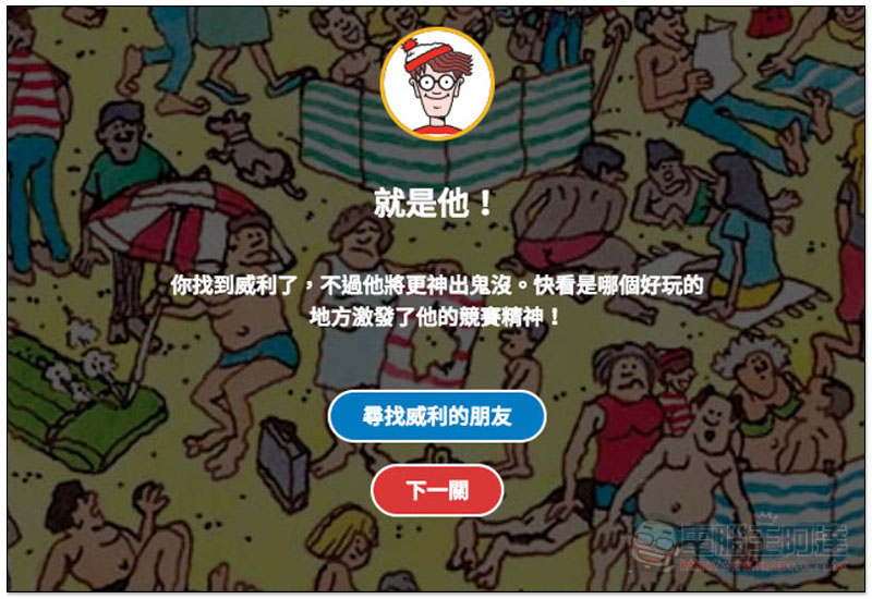 一般來說都要找到全部角色,才能進到下一關,但 Google Maps 這遊戲有一個小技巧,就是你只要找到主角威利,就能直接跳到下一關(或你想繼續找威利的朋友也行):