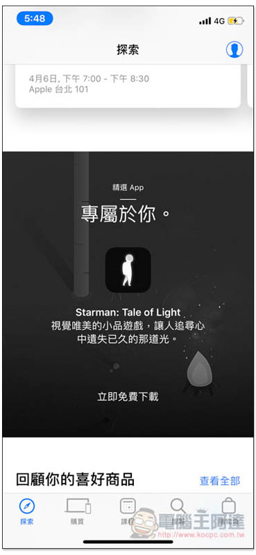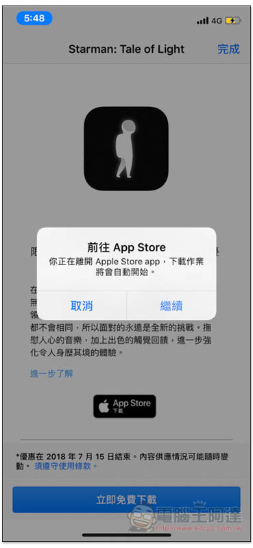 而進入到 Apple Store 後,探索頁面往下滑,就會看到新的精選 App 活動 Starman: Tale of Light,下方也有註明 “立即免費下載” 的字樣: