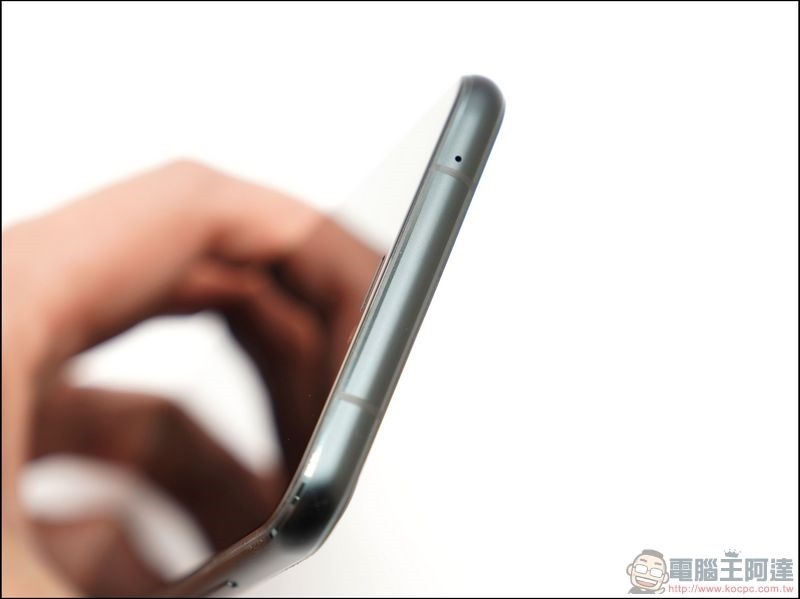 而螢幕下方也採用了圓形導角轉折的設計並配置了可隱藏的導航列讓使用時有更大的視覺感受,螢幕上方覆蓋了一層 2.5D 玻璃與金屬中框完美結合,觸感非常好: