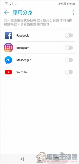 ZenUI 5 延續了華碩系統簡單易用、功能超多的傳統,簡易模式、兒童模式一應俱全,也支援多項軟體的雙開應用,可在同一支手機中使用兩個完全不同的帳號,相當方便: