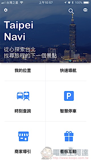 從上面的下載以及導引頁面來看,這個 App 其實操作與排版都相當簡單易懂。在看完了導引頁面之後,即可進入首頁,並能從主頁存取包括:我的位置、快速導航、時刻查詢、智慧停車、商家導引與看板互動這六大功能: