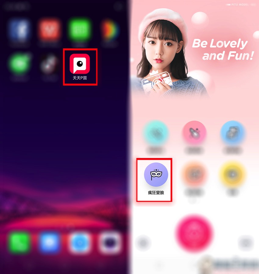 首先在桌面上找到天天 P 圖 APP,接著直接點選進入,一進入後會看到主畫面,立刻點擊左下角紫色圈圈的「天天變臉」。