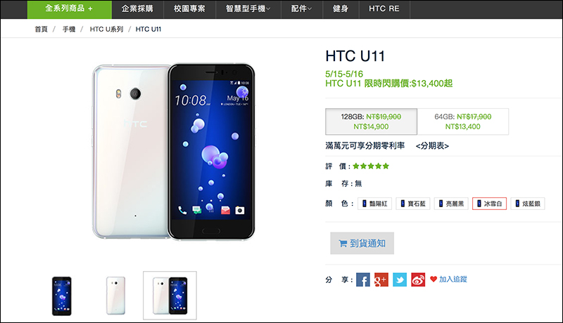 截稿前查詢網路通路部分,目前 U11 的貨源還算充足。除了 128G 的「冰雪白」沒有現貨,其它的四種顏色選擇都是可立即購買的狀態: