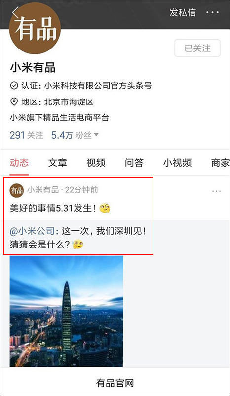 起初,小米官方微博只提到「這一次,我們深圳見!猜猜會是什麼?」,小米相關的微博帳號如 CEO 雷軍、小米手機都轉貼該貼文。但其中「小米有品」官方微博在轉貼此則微博貼文時提到了「5.31」,也進一步證實發表會將在 5 月 31 日來臨。: