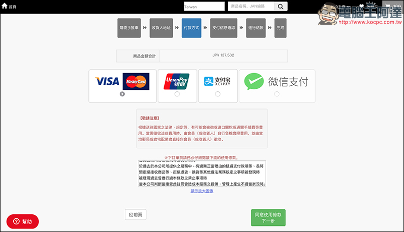 下一步要選擇付款方式,目前提供 VISA 、 MasterCard 、銀聯、支付寶和微信支付這五種,可惜同樣無法使用 JCB 信用卡付款: