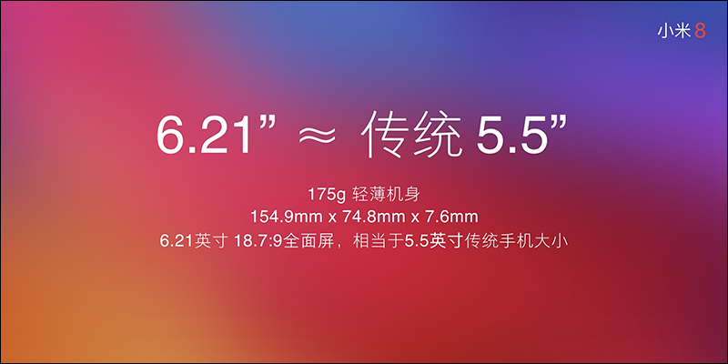 因此即便螢幕尺寸來到了 6.21 吋,但藉由更高的螢幕佔比與機身邊緣設計,讓其手感與傳統 16:9 比例的 5.5 吋智慧型手機相當。小米 8 的機身尺寸為 154.9mm x 74.8mm x 7.6mm ,機身重量 175 克。: