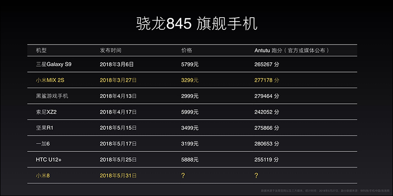 硬體毫無疑問搭載今年旗艦智慧型手機所使用的高通 Snapdragon 845 處理器,而在今年眾多它牌搭載 Snapdragon 845 旗艦手機中,小米 8 在 Antutu 跑分會得到多少呢?