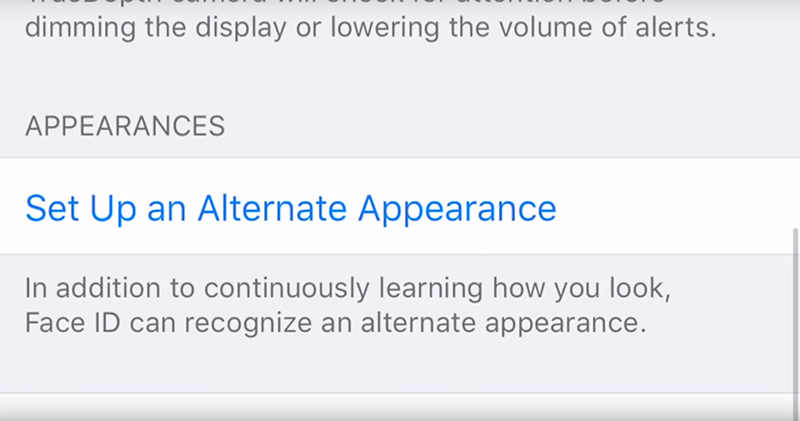 先前 Face ID 僅有機會雙胞胎或者是刻意製作面具破解的情況下,才有機會透過讓系統支援兩個人以上的解鎖方式。而在 iOS 12 之中,在「Face ID 與密碼」的選項之中,將出現下圖這個設置替代外觀的全新選項,讓你可以如同指紋辨識可以登錄多個手指一樣,可以額外登錄另一張解鎖面孔。