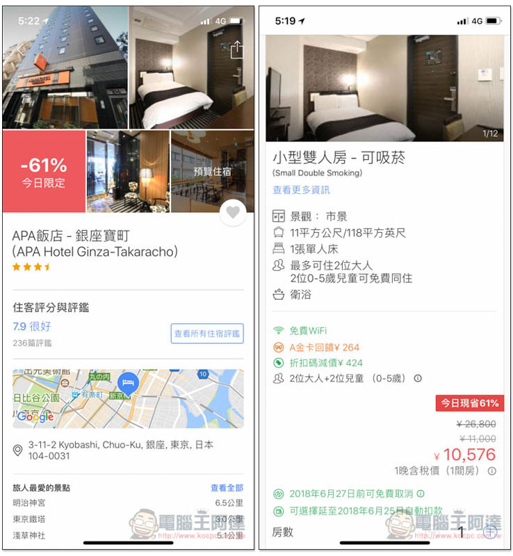 再來換到 Agoda 查同一間與同一天住宿,一樣是基本雙人房(可吸菸與禁菸價格相同),含稅價格為 JPY10,576,雖然便宜個近 500 日幣,但換算成台幣也才 135 元左右,用這價換取日本免費無限行動上網也不錯: