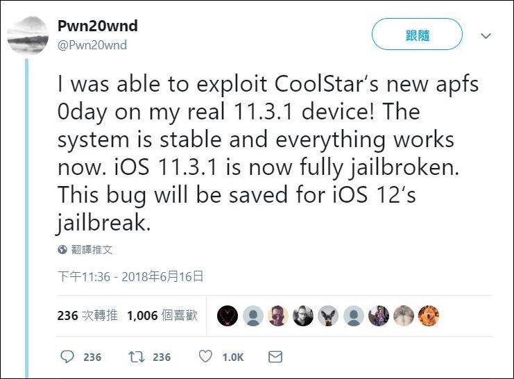 專門研發 iOS JB 漏洞的技術大神「Pwn20wnd」昨天晚上在 Twitter 上面宣布已經利用一組由另一位開發者 CoolStar 所提供的 apfs0 漏洞,在他的 iOS 11.3.1 裝置上完全越獄,並可以穩定工作使用。