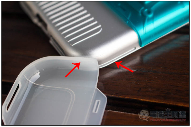 有些人可能會擔心 PC 外殼會不會容易掉,這點可以放心。首先從下圖可以看到,與內側 TPU 結合的邊緣處有凹溝卡榫,因此裝上後會卡住,不是蓋上而已: