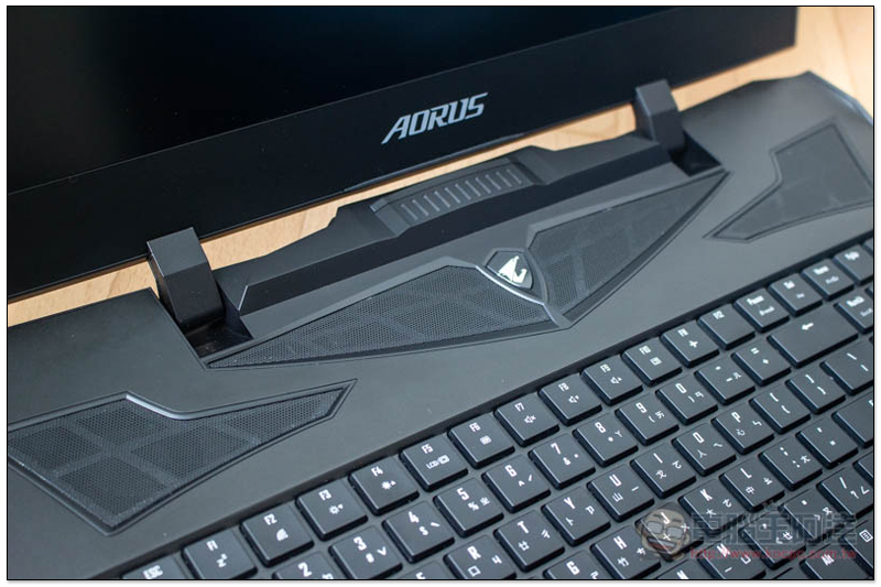 雖然對電競筆電而言滑鼠觸控板算是比較少用的一部分,但 AORUS 一樣沒忽略掉這邊,滑起來相當柔順舒適,按下力道也適中且很有回饋感,少數讓我非常滿意的滑鼠觸控板。表面也印有 AORUS 獨家老鷹頭像: