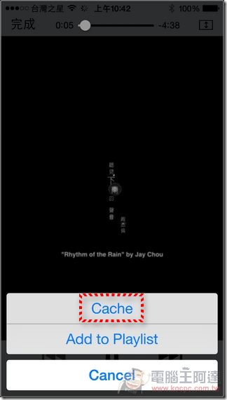 只要執行播放,在畫面中會跳出「Cache」功能,執行後 i-FlashDrive One App 就會開始下載影片: