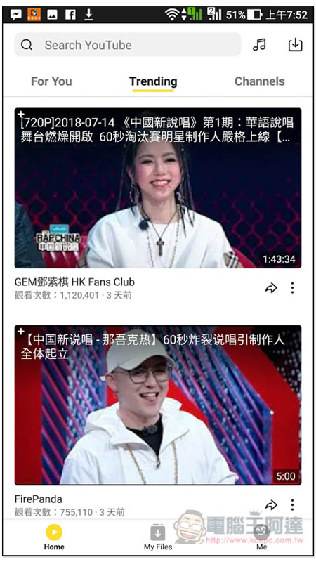 App 首頁,下方會列出支援的網站,預設是最多人用的 YouTube,你可以直接於上方輸入關鍵字,找想要看的影片、聽的音樂。下方也會列出一些發燒影片: