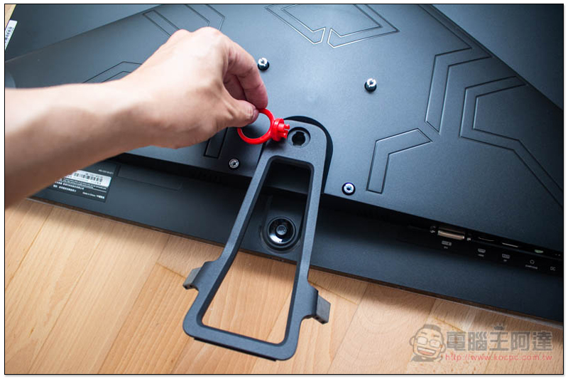 底座安裝方式非常簡單,先把中間的支架裝上背面指定位置後,鎖上紅色拉環: