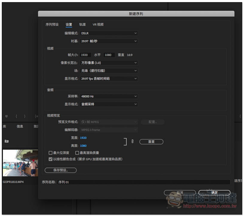 如果你已經有影片序列,可以跳過這步,單純想把兩部影片剪輯成並排的話先建立新的序列,設定你想要的影片長、寬以及 FPS: