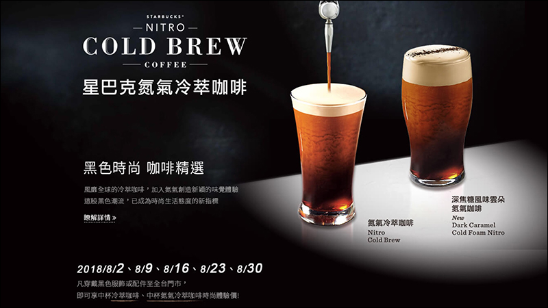 只要在 2018 年 8 月的每週四,凡穿著或配戴「黑色相關衣服或配件」至全台門市點購指定產品,享有中杯冷萃咖啡體驗價 NT$105 、中杯啖氣冷萃咖啡體驗價 NT$130 。