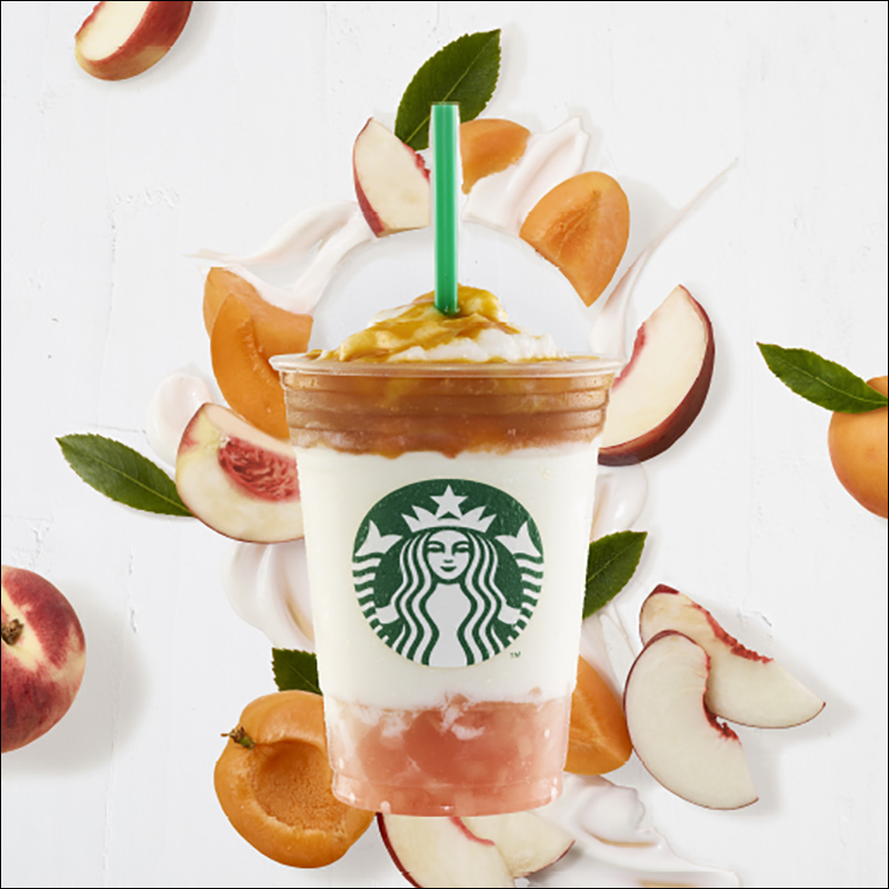 使用 2 種水果綜合調成的星巴克優格系列星冰樂「蜜桃杏桃優格奶霜星冰樂」,底層白桃吉利、中層酸甜的優格星冰樂及美味的杏桃果醬組合成的星冰樂口味。售價方面 NT$145 起(中杯)。: