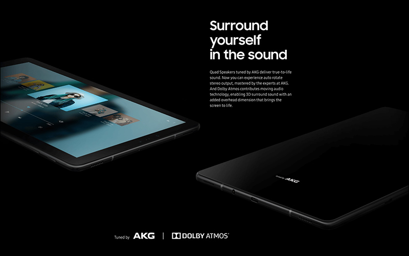 除了在工作方面的用途,針對娛樂使用也有所加強。 Galaxy Tab S4 配備經過旗下知名音響品牌 AKG 調校的 4 組揚聲器(分別設置於機身頂部、底部個 2 組),同時這次更具備 Dolby Atmos 杜比全景聲,在看電影的立體音效表現值得期待。: