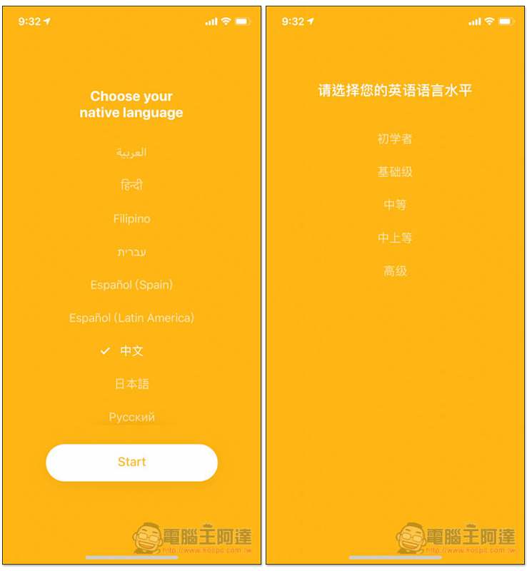 Bright – English for beginners 不算是一套完全免費的英文單字學習 App,有提供訂閱功能,後面會再介紹。一開始選擇你的母語,除了中文外,也提供日本語、菲律賓、西班牙語等等,另外還有英文程度的級別。雖然有中文,但是是簡體中文,這點就無解了,只能看未來官方會不會加入繁體中文: