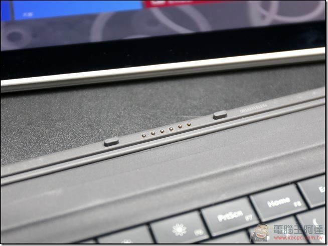Surface 3 要安裝實體鍵盤保護套也相當簡單,在平板下緣中間區域配置了磁吸卡榫與感應接點,這就是要連結保護套的區域: