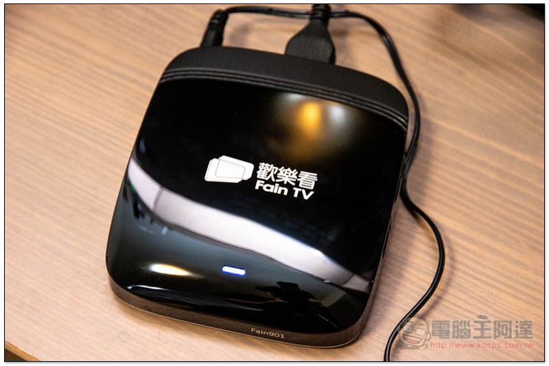 以這價格,歡樂看電視盒的外型有讓我小驚豔,還算有質感,頂部的亮面材質與前端弧形設計加分很多,特別是在燈光下反光照射的情況,遠看質感很不錯。中間有印上歡樂看的 Logo,弧面上也配有一個 LED 燈,開機後會亮起: