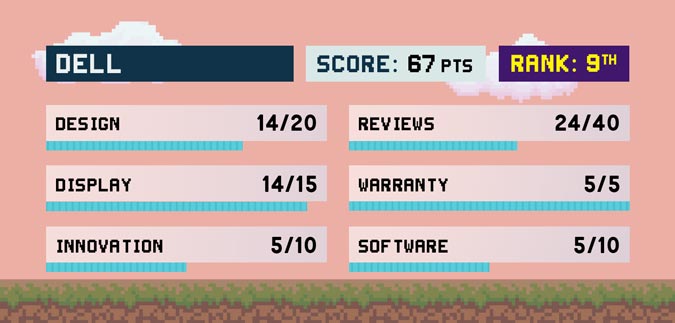 DELL 雖然知道如何製作出一款高效能筆電,如:XPS 或 Alienware 17 R5,但他們並沒有將專有技術與 Dell 的筆電品牌結合,這也是為什麼排在最後一位的原因。由於有待改善的顯示螢幕、淺鍵盤以及缺乏遊戲專用的調教軟體,Dell 入門的遊戲筆電 Inspiron Gaming 15 5000,相較於兄弟品牌 Alienware 相差甚遠。不過,今年新推出的 G 系列筆記本電腦,如 G3 15,或許是 Dell 未來提升排名的一盞明燈: