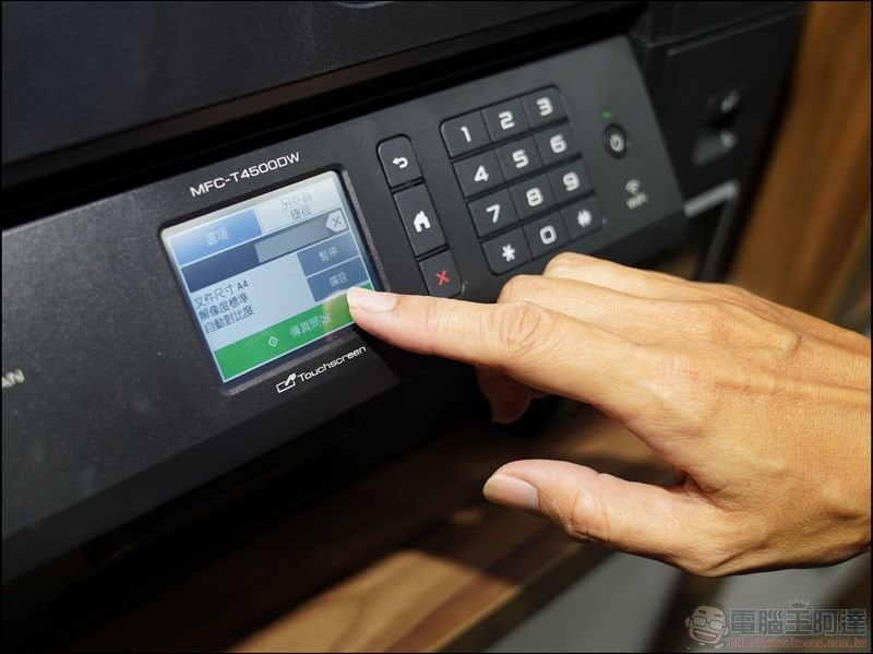 接下來就更簡單了,相信以往很多人會在印表機/掃描器這類裝置的驅動程式安裝卡關,這在 MFC-T4500DW 上面很難有這個問題發生,因為他支援 USB、RJ-45 與 Wi-Fi 等連線方式,設定方法接近無腦,看著小螢幕跟著做就搞定,首先按下觸控小螢幕上的 Wi-Fi 鍵: