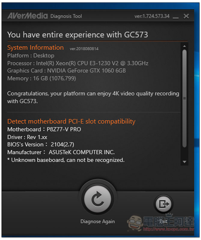基本上只要符合官方提供的硬體需求,錄製 GC573 或 GC553 的最高影像格式就不是問題,但如果你還是擔心的話,圓剛也有提供分析工具 Diagnosis Tools,一鍵就能知道你的硬體夠不夠: