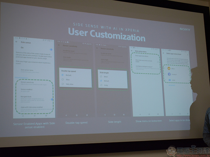 在 Xperia XZ3 上搭載的 3D 螢幕,邊緣曲線部分不僅是視覺上瑩亮美麗,在螢幕側面也配有新的感應功能。在雙擊螢幕側面會顯示快速側框,在此部分的 UI 設計上會適應使用者的手部握持,為了防止手掌、其他手指或虎口誤觸,AI 對大拇指的部分進行偵測,無論你的手指如何握機,拇指在哪個位置雙擊,邊欄顯示的位置會以拇指的高度為主,以便於使用者進一步選取與操作。