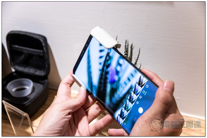 中間鎖上外接鏡頭的圓孔,也具備滑動結構。安裝步驟致如下,先把這個圓孔移動到你手機前鏡頭或後鏡頭的位置,接著再夾上 AllClip 即可,而為什麼要先對準鏡頭?這是因為夾上後,圓孔底部幾乎會跟手機水平貼合(放心,底部有橡膠,不會刮傷鏡頭或螢幕),無法再輕鬆左右移動: