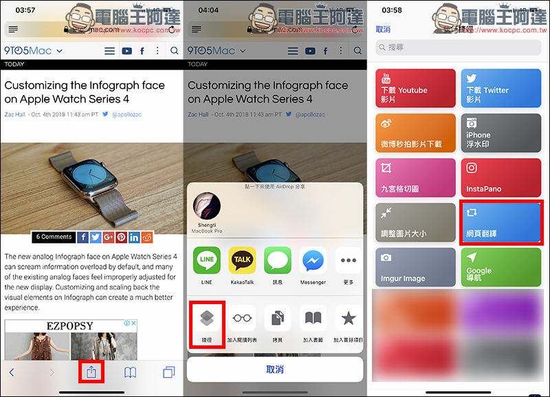 在瀏覽器點選「分享」按鈕,接著按下「捷徑」並選擇「網頁翻譯」。: