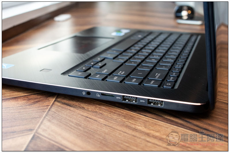 I/O 端也很豐富,該有的都有,右側提供兩個 USB 3.1、Micro SD 讀卡機與耳機孔,另外從這角度也可以看到,鍵盤左右兩側都有加入一條鑽石切邊設計的玫瑰金邊框,這加分很多,不僅提升質感,整個外型也更有層次設計感: