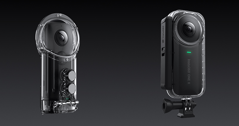 ▲圖:左邊的潛水殼配件可支援深達 30m 的潛水使用,搭載的是一般的 1/4 吋腳架孔;右邊的輕便防水殼則僅可支援 5m 防水,但搭載的是運動相機的底座設計(也依然支援 1/4 吋腳架孔)(來源:Insta360)