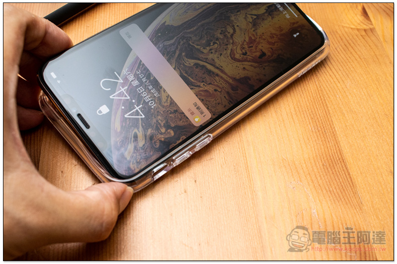 TPU 防撞邊框柔軟度與扎實性都很不錯。另外也因為是軟的,裝上 iPhone Xs/Xa Max 時,不會擔心會不會刮傷機身或螢幕:
