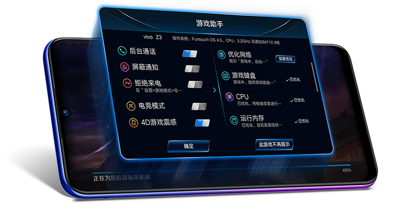 為了提供玩家更優質的遊戲體驗,在這款新機上擁有 vivo 自家的 vivo Dual-Turbo 雙渦輪加速引擎(遊戲加速 + 系統加速),號稱可將 Z3 的遊戲加載速度提升 27.6%,在玩像是 PUBG Mobile 或是王者榮耀等中國主流遊戲能夠有效抑制掉幀的狀況;另外還配有如手把般震動回饋,不管是遊戲中爆炸的衝擊或射擊時的後座力都能讓玩家如同身歷其境,加上遊戲助手的軟體加持,玩家更能有效地調用手機資源,玩起來更暢快。
