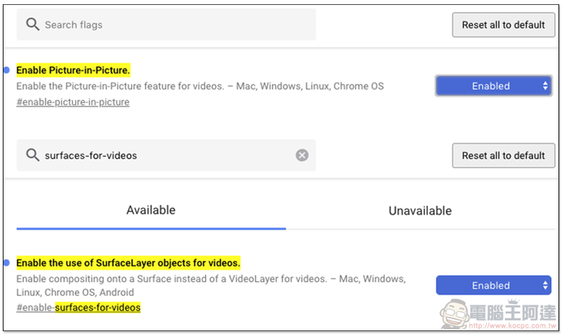 chrome://flags/#enable-surfaces-for-videos