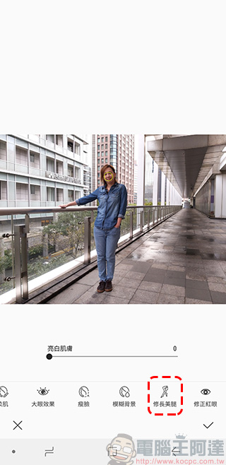 就連想要讓整體身形比例看起來更修長,只要系統偵測到照片是全身照就會出現「修長美腿」的功能,可以在這裡一鍵搞定。
